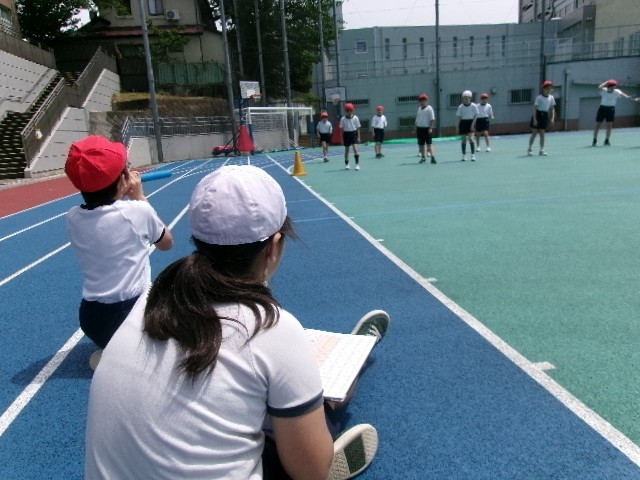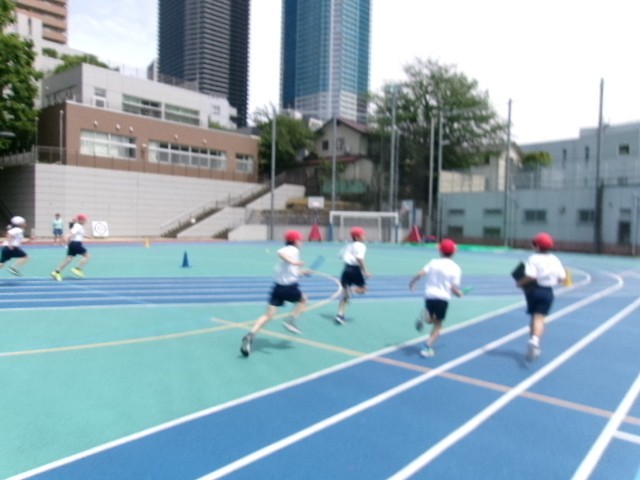 短距離走・リレーの学習です。今日は「スピードを落とさずにバトンパスできるようになる」ことを目指して練習が始まりました。パスの練習をする子、それをチェックする子と、役割分担しながら協力して練習しています。