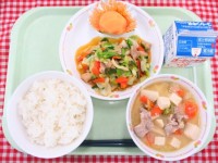 みそ汁には、今が旬の「かぶ」が入っています。今日は、根の部分だけではなく、葉も入れました。かぶの葉にはビタミンA、B1、B2、Cなど豊富に含まれ、風邪を予防したり、肌の調子を整える働きがあります。ほうれん草や小松菜だと思っていた児童も多く、かぶの葉も食べられることを知り、とても驚いていました。