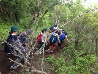 明神山下山。「ビーケアフルっ。」と言いながら、声をかけあって元気に下りてきました。