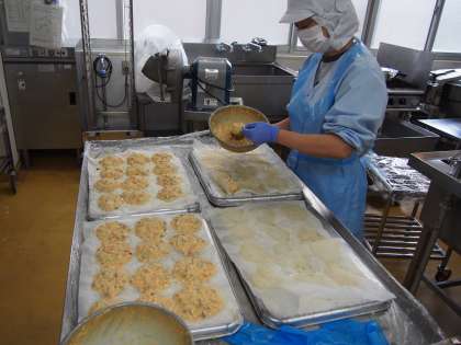 青森県の料理「いかメンチ」を作っています。生地を1つ1つシートにのせたあと、一度に油に入れてこんがり揚げます。