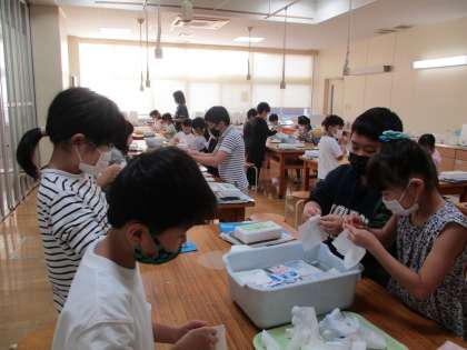 牛乳パックをリサイクルしてはがきづくりをしました。牛乳パックを水につけておき、コーティングを丁寧にはがし「パルプ」を取り出しました。その「パルプ」をミキサーで細かくして水にとかし「紙すき」をしました。かざりつけをし、乾燥させて完成です。「牛乳パックからこんなにきれいなはがきができてびっくり。」「リサイクルしてまた新しいものができるってすてき。」など、リサイクルの大切さを改めて実感することができました。