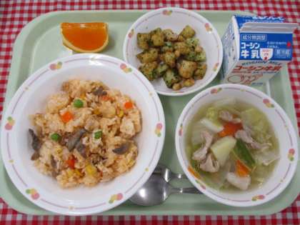 ≪献立≫ チキンライス・野菜スープ・青のりポテトビーンズ・ 清見オレンジ・牛乳