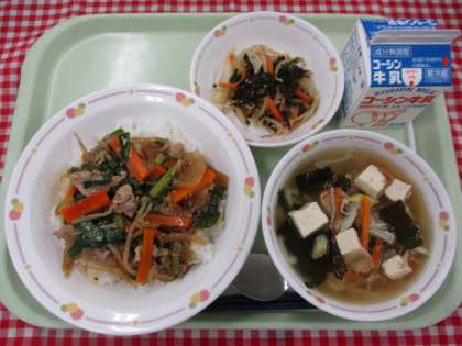 ≪献立≫ 韓国料理 プルコギ丼・わかめと玉ねぎのスープ・チョレギサラダ・牛乳