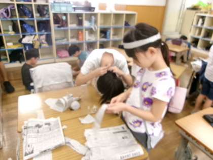 図工の学習で、新聞紙と仲良くなろうというテーマで活動しました。ボールを作ったり、テントを作ったりなど、想像力を働かせて楽しみました。