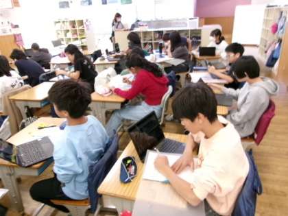 豊島区の取り組みを調べ、タブレットを活用してまとめていきます。教室全体がシーンとした雰囲気で、集中して取り組んでいるのが伝わってきます。