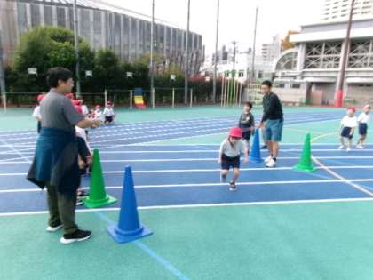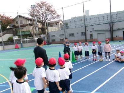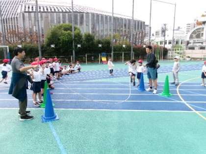 回っている縄を「走り抜ける」ことをテーマに子供たちが挑戦しました。担任が縄を回しながら、縄に走りこむタイミングや走り抜ける方向などを丁寧に伝えながら、子供たちが意欲的にチャレンジしていたのが印象的です。