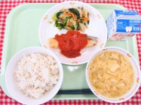 ゆかりごはん・あじフライ・かぼちゃと大根のみそ汁・野菜のごまあえ・冷凍みかん・牛乳