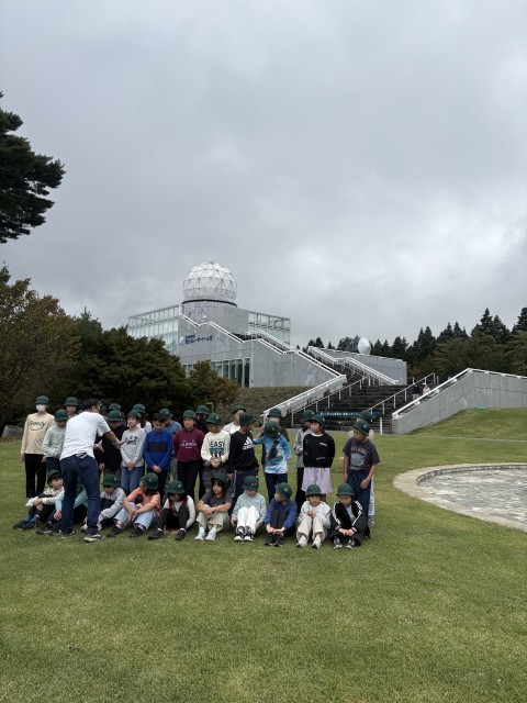 移動教室最後の目的地である富士山レーダードームに着き、まずは記念撮影。