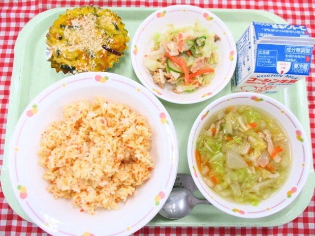 ≪献立≫ にんじんごはん・さつま芋と南瓜のグラタン・白菜とベーコンのスープ・ツナ...