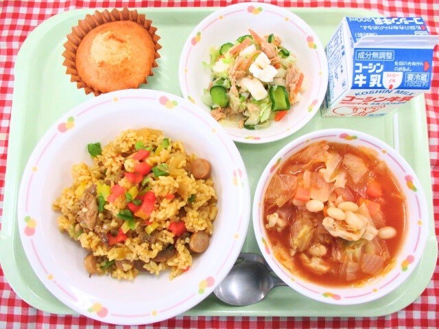 ≪献立≫ スパイシーピラフ・白いんげん豆のトマトスープ・イカとツナのサラダ・マド...