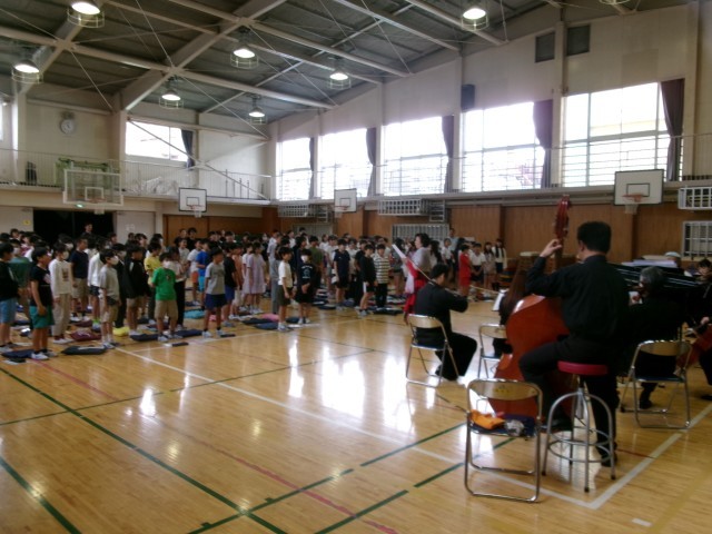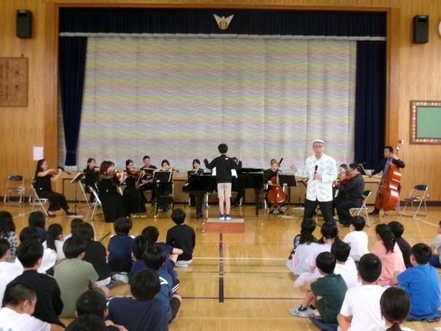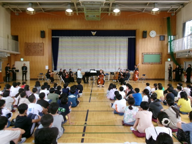 今日は、「笑顔と学びの体験活動プロジェクト」で「青島 広志・ブレーメンオーケストラ」の皆様にすてきな演奏を披露していただきました。各楽器の紹介と音色紹介、代表児童による指揮者体験、そして様々な曲の演奏などとても充実した時間となりました。オーケストラの皆様の演奏による校歌も、すてきな演奏と歌声が体育館中に響きわたりました。ご来校いただいた学校運営協議会委員の皆様からも、「児童の歌声がすてきでした。」「迫力あるオーケストラの演奏でした。」との感想をいただきました。