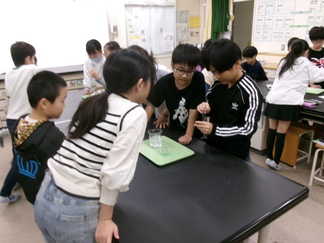 4年2組の理科の学習の様子です。「ものの温度と体積」の学習をしています。「空気の温度が変わると、空気の体積はどうなるのだろうか。」という学習問題を解決するために教室で予想を立てて、理科室で実験を行いました。試験管を温めたり冷やしたりしながら、実験の結果を視覚的にとらえていました。また、ノートに結果や考察をまとめる場面では、一人一人が工夫しながら言葉や絵で表現していて、その表現力の豊かさに感心しました。