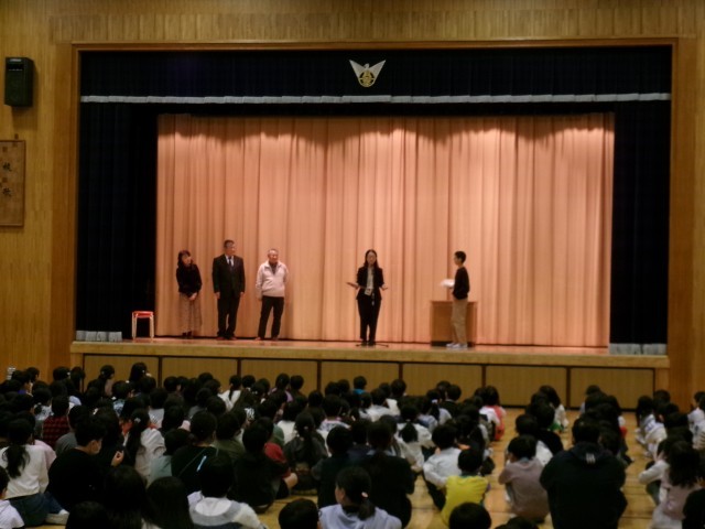 本日の全校朝会では、コミュニティ・スクール学校運営協議会委員の方が、「みんなで長縄や短縄を跳んでほしい。」というお話をしてくださいました。そして、全労済の方から代表児童が長縄や短縄を受け取りました。今週は、長縄集会もあります。これからもみんなで長縄に取り組んでいきたいと思います。