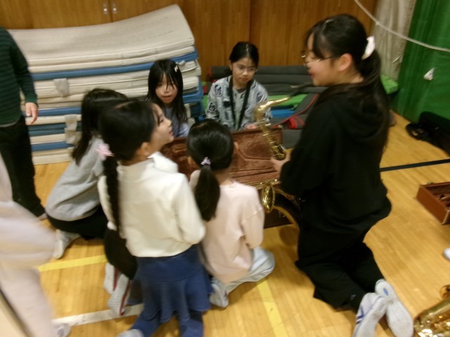 今週は、3年生のジュニアバンドの体験活動が始まりました。この日は、どんな楽器があるのかを見たり、また楽器にふれたりしていました。