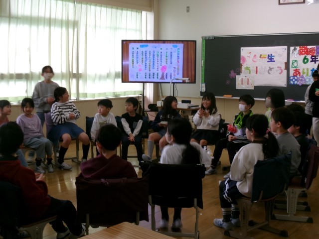 6年生を送る会が終わった後は、アミーゴ班に分かれて活動をしました。「お別れアミーゴ班活動」では、各班で6年生に感謝の気持ちを伝えたり、ゲームをしたりして6年生と楽しい時間を過ごすことができました。5年生が中心となって班をまとめ、すてきな活動になりました。