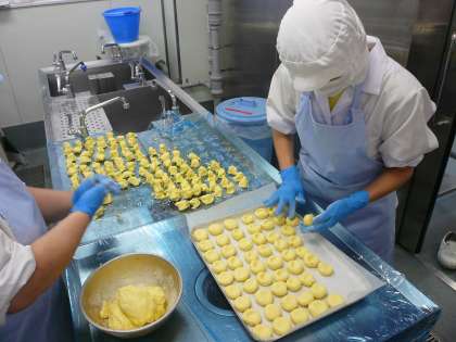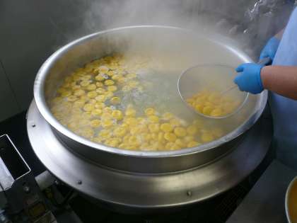 今日はお月見に合わせ、手作り団子を作りました。かぼちゃを練り込んだお団子は、満月のようなきれいな黄色に茹で上がり、もちもち・つるんとしていて、黒蜜だれとよく合い、好評でした。