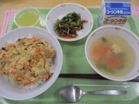【献立名】 牛乳 ごはん 白身魚のふわマヨ焼き ハムサラダ ミネストローネ