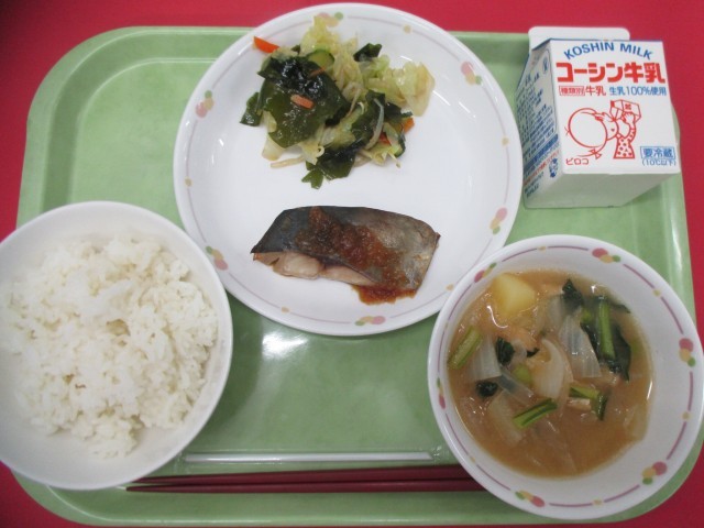 今日の献立は和食の献立です。主食となる「ごはん」、主菜となる「魚のかわりソースがけ」、副菜の「やさいのピリからあえ」、汁物の「みそ汁」です。和食の良さの一つが、様々な食材を使うことで、栄養バランスの良い献立になりやすいことです。