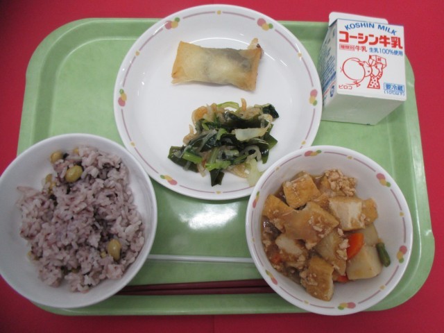 また、ススキとともに、萩の花を飾る風習があることから、今日の給食では、黒米を花に、青大豆を葉に見立てた萩ごはんを炊きました。なお、十五夜は別名芋名月とも呼ばれるため、今日の生揚げと里芋のそぼろ煮には里芋が入っています。