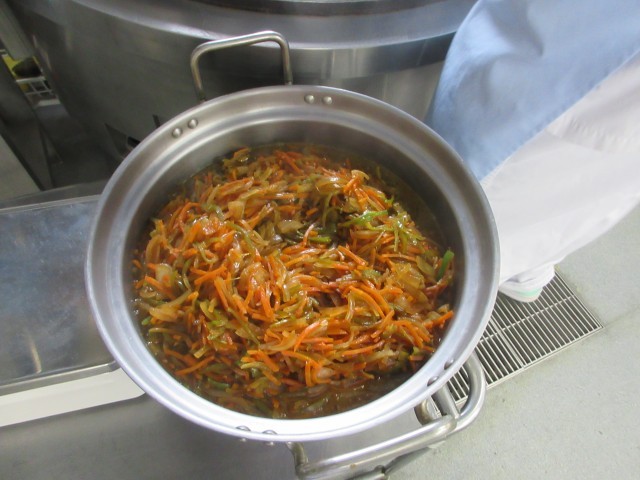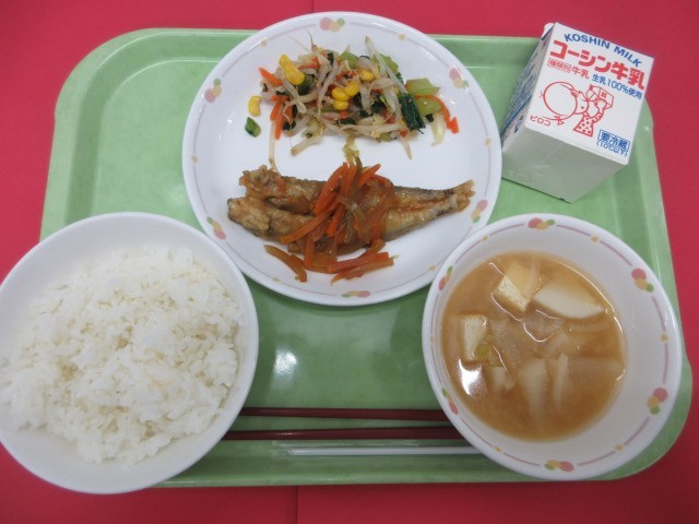 さて今日は和食の献立です。芋や大豆製品、野菜、魚など様々な食材が使われています。様々な食材は、白いごはんを引き立たせるのと同時に、いろいろな栄養素を補っています。特に「ししゃものなんばんづけ」のししゃもは骨ごと食べられるため、カルシウムをしっかりとれて、歯や骨を丈夫にするのに役に立ちます。