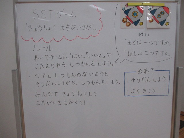 本日の2時間目の1年生の小集団活動で行われたSST(ソーシャルスキルトレーニング)ゲームの板書です。