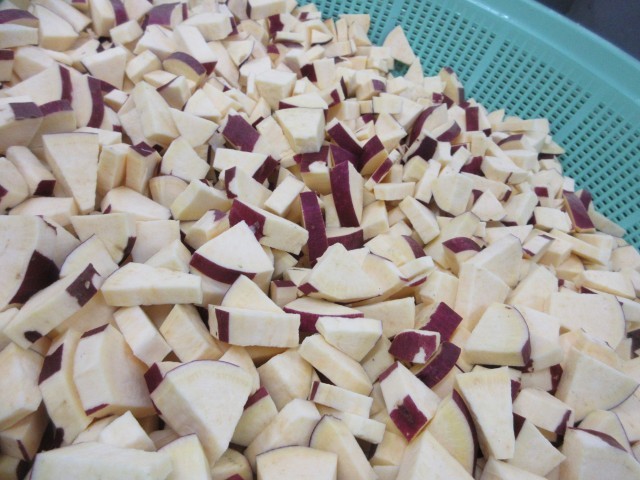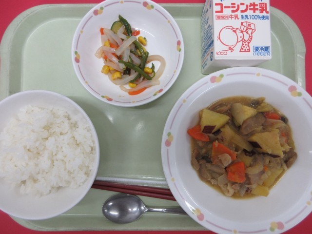 今日の主菜は「鶏肉とさつまいものうま煮」には、秋が旬のさつまいもをたっぷり使っています。秋には、果物や魚、野菜など旬の食べ物がたくさんあります。これからも給食には、秋が旬の食べ物が色々登場します