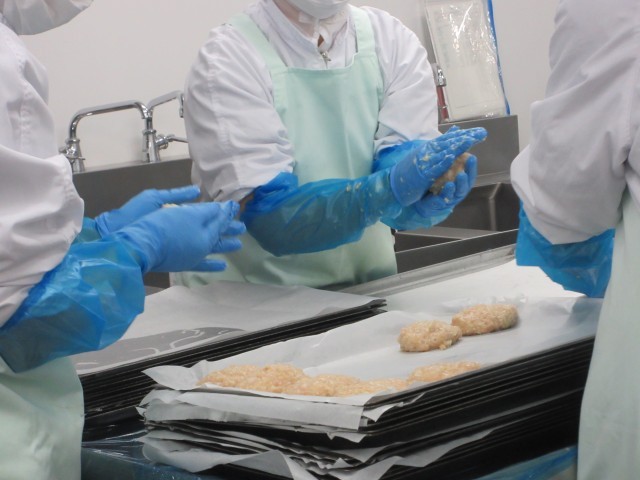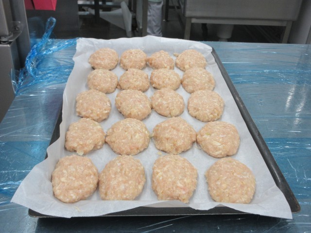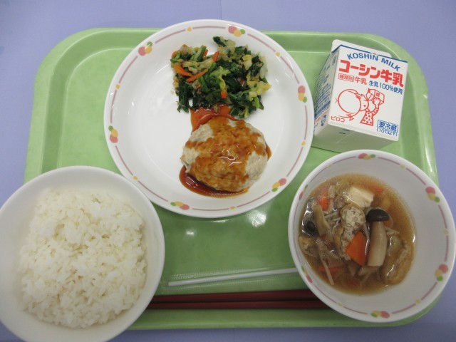 今日はれんこん入りつくねやきをつくりました。れんこんは半分すりおろし、半分みじん切りしたものを練り合わせてオーブンで焼きました。つくね焼きには、れんこんだけでなく玉ねぎとごぼうが入っているので栄養満点のメニューになっています。また、きのこ汁にはまいたけやぶなしめじ、えのきたけが入っています。きのこには、食物繊維やビタミンD、ビタミンB1などの多くの栄養素が含まれているため免疫力を高める効果があります。