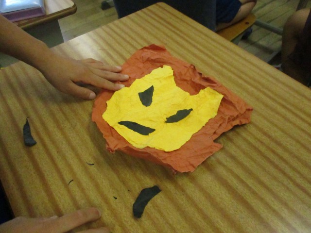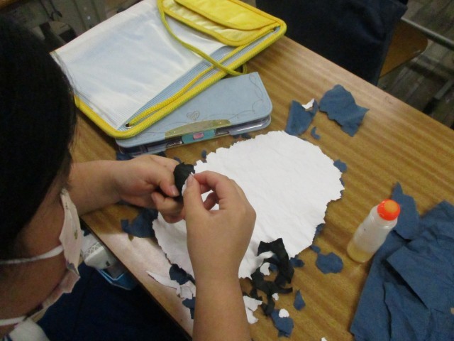 色画用紙をくしゃくしゃふわふわにして、マスコットづくりをしています。