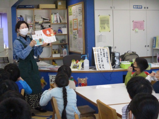 学校司書の先生に「冬」に関するブックトークや読み聞かせを行っていただき、その後、自分で「冬」に関係する本を探して読みました。