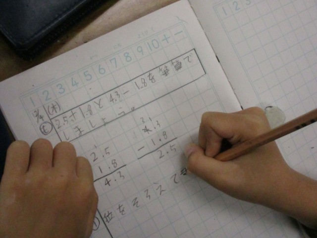 小数の筆算は小数点を意識しながら位を縦に揃えることに気を付けて計算練習を進めています。