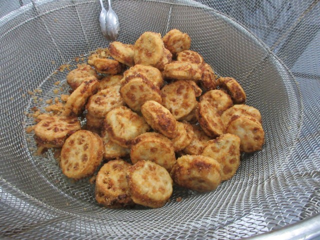 今日の主菜は、秋から冬が旬の野菜である蓮根を使って「れんこんのはさみ揚げ」を作りました。八百屋さんから届いた蓮根の節の大きさから、はさみ揚げに必要な枚数を計算して、一つ一つ薄くスライスしました。スライスした蓮根に肉だねを挟み、衣をつけて油で揚げました。