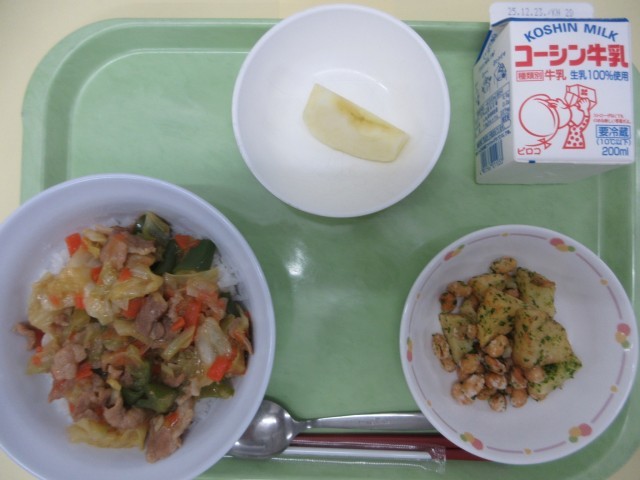 12月に入り、給食では東京都産のキャベツを使っています。新鮮な東京都産キャベツをたっぷり使ったホイコーロー丼は、教室でおかわりの列ができるほど大人気でした。