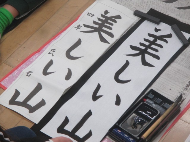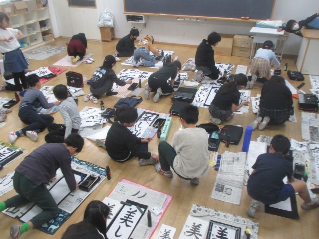 席書会と同じようにレジャーシートや新聞紙を広げ、床に座った状態で書きました。4年生は「美しい山」です。学校の練習で3枚、冬休みにご家庭で4枚、席書会で3枚取り組みます。本番に向け着々と練習をしています。お忙しいとは思いますが、冬休み、ご家庭でもよろしくお願いいたします。
