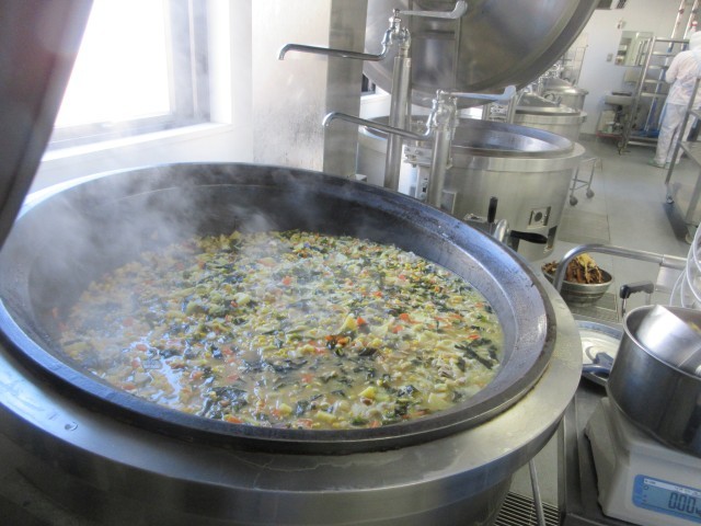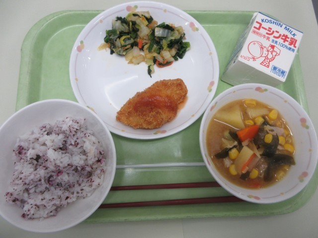 今日の汁物は、北海道の「どさんこ汁」です。「どさんこ」とは、北海道でうまれたもののことを言います。北海道は、広大な大地で、農作物や酪農が盛んな地域です。これらの野菜やバターを使った汁物を「どさんこ汁」とよんでいます。北海道は、玉ねぎを始め、収穫量が全国1位の食材がたくさんあり、この「どさんこ汁」1杯で北海道のおいしさが楽しめます。今日は北海道産のじゃが芋やコーンを使いました。