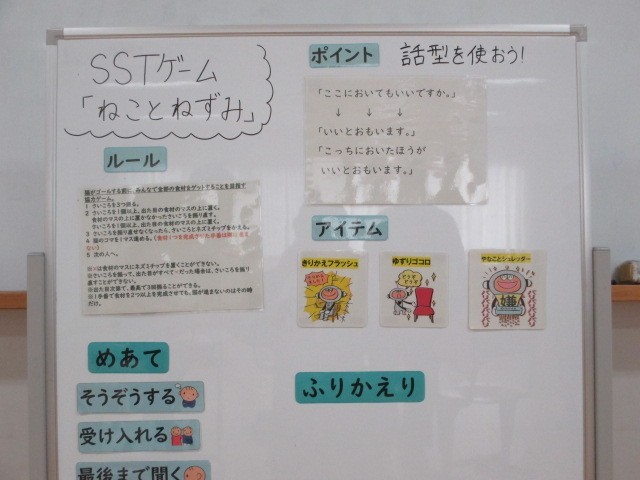 今日の小集団学習では、「話型を使って上手に相談しよう」というテーマで「ねことねずみ」というゲームをしました。