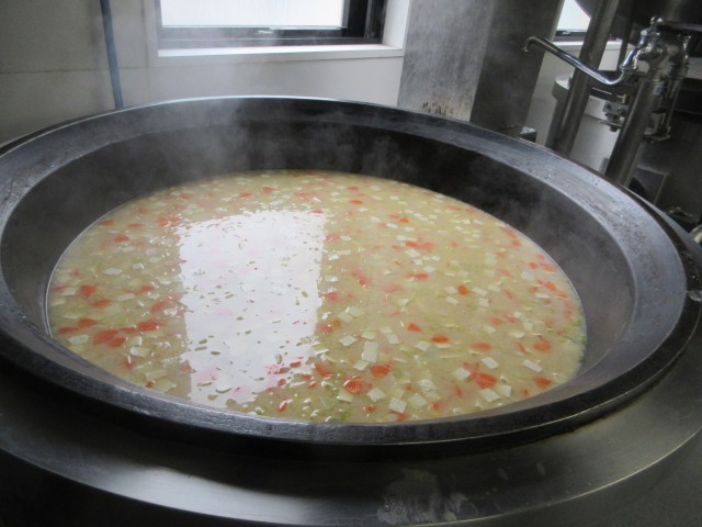 今日の汁物は「みそけんちん汁」です。かつおのけずり節でとった出汁に、西京みそを合わせたみそで味を付けました。具材が豆腐や里芋、大根などとシンプルな分、出汁とみそのうまみがよく味わえます。