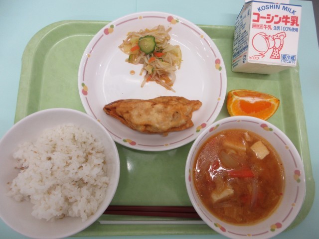 今日は、千登世橋中学校、目白小学校、南池袋小学校、高南小学校の4校が同じ給食です。「千登世橋中学校でも大人気、小学校に食べてほしい中学校の給食」を、4校の栄養士がひとつの献立になるように考えた献立です。