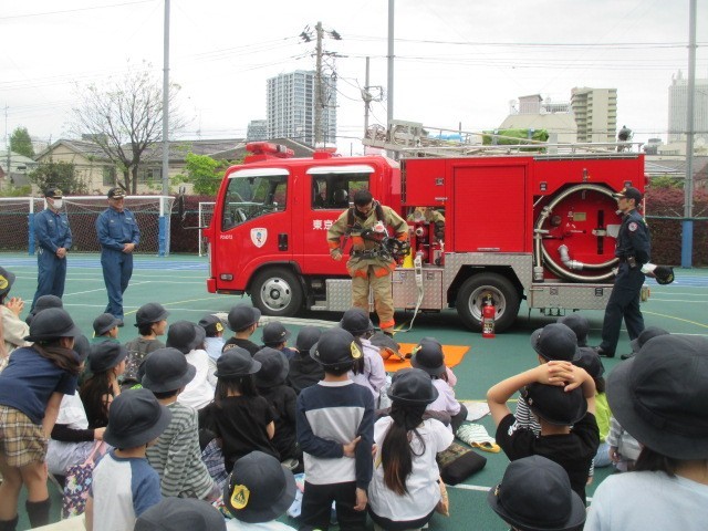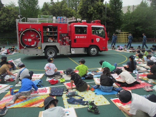 3、4時間目の図工の時間に、消防署の方をお招きして「はたらく消防写生会」を行いました。