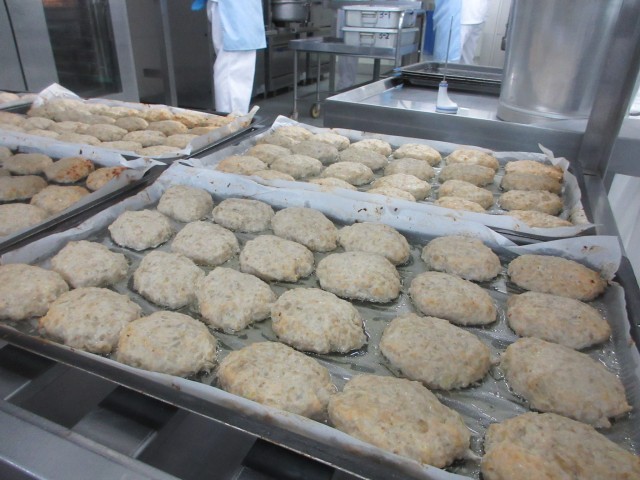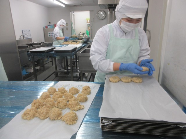 今日の主菜は、れんこん入りつくね焼きです。名前の通り今日のつくねにはれんこんが入っています。れんこんは半分は、すりろし、半分は刻んであります。すりろしたれんこんを入れることで、ふんわりとした食感となり、刻んだれんこんがシャキシャキとした食感になるので食べ応えがあるつくねになります。