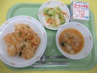 今日のごはんには、ふつうの白米にプラスして「黒米」というもち米が入っています。少量入れるだけで、ごはんがうす紫色に染まります。