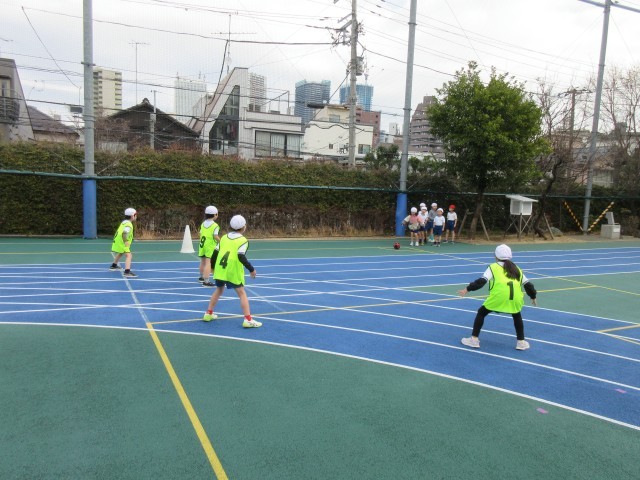 体育のボール蹴りゲームでは「あつまりキックベースボール」に取り組んでいます。