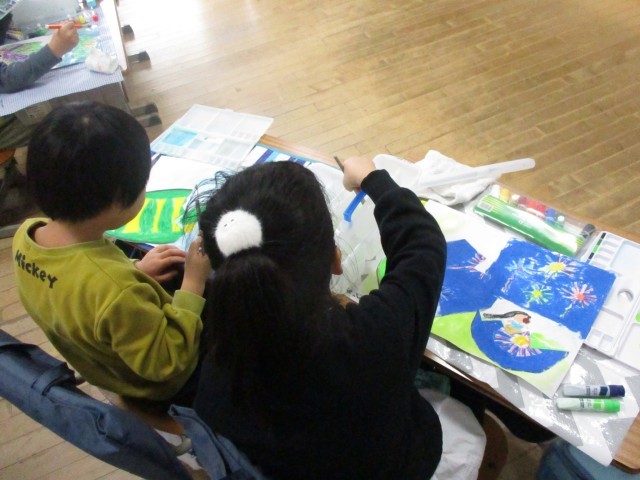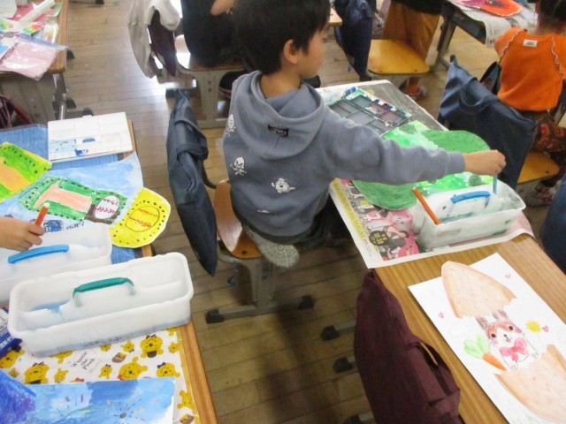 2年生が図工の時間に絵の具とクレヨンを使って「ふしぎなたまご」を作成しています。