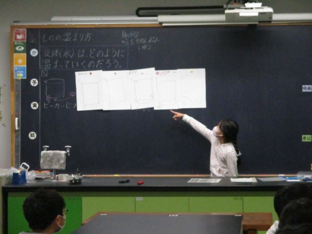 なぜそう考えたのか友達の発表を聞きながら、自分の考えと比較した後、実験ではサーモインクを使って視覚的に確認しました。
