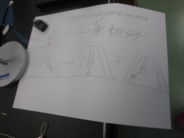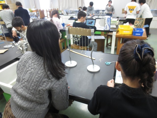 共振のふりこ、ウェーブのふりこ、ニュートンのゆりかご等、自分が作りたいふりこを選び、種類ごとのグループに分かれておもちゃ作りを行いました。
