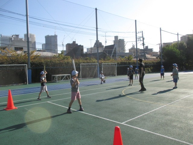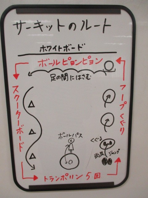 感覚統合運動では、目と体の協応を促したり、調整力(バランス感覚)を高めるためのトレーニングを行いました。線の上を真っすぐ歩行したり、輪くぐりをしたり、けんけんぱをしたりしました。どの動きも昔遊びにつながる動きです。安全を確保できる場所があれば、道具がなくてもできる遊びが子供たちの運動機能を高めることにつながります。