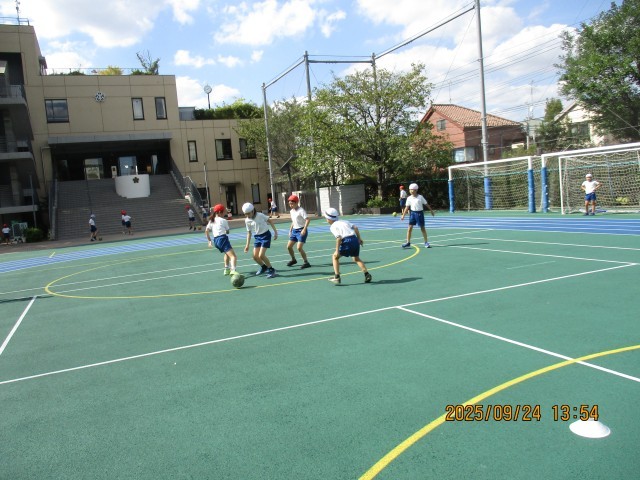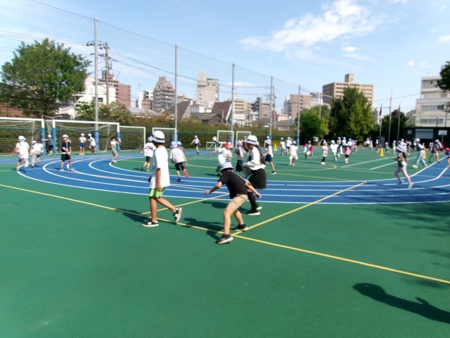 校庭では、複数の班が合同で鬼遊びをして元気に走り回っていました。