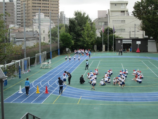 校庭では、複数の班が合同で鬼遊びをして元気に走り回っていました。