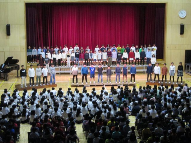 全校で音楽朝会を行いました。向かいに立っている学年まで届けるイメージで、『ゆかいに歩けば』を歌いました。