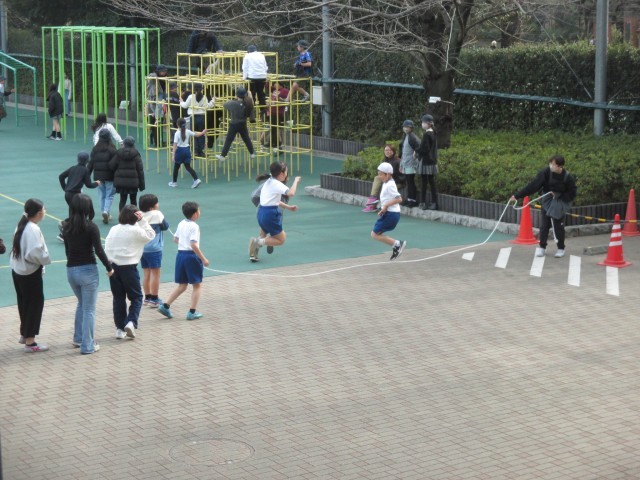 先週、体育朝会で行った短縄に外遊びで取り組む児童も多くいます。