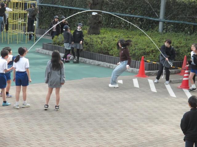 昼休みは高学年の外遊びでしたが、4年生から6年生が一緒に大繩で体を動かす様子が見られました。